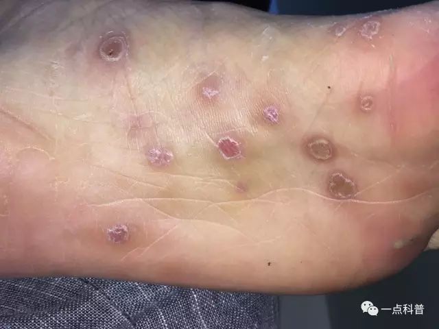 Вы можете заметить появление медно-красных пятен на ладонях и подошвах.